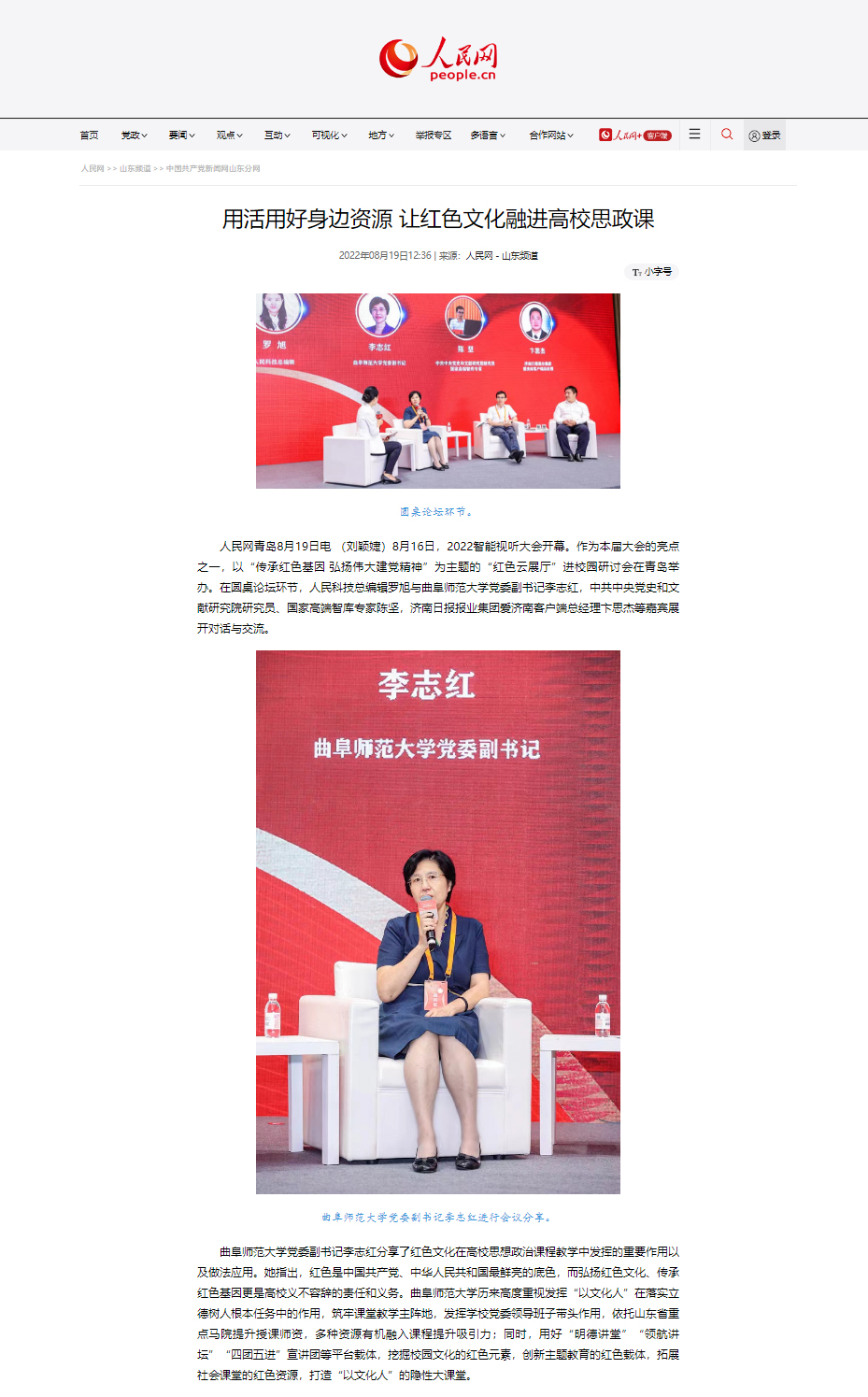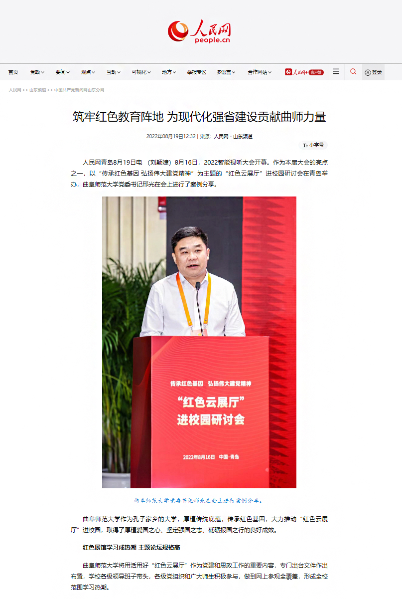 8月16日,由中央网信办、人民日报社、山东省人民政府指导,青岛市人民政府、山东省委网信办、人民网主办的2022智能视听大会开幕。作为本届大会的亮点之一,以“传承红色基因 弘扬伟大建党精神”为主题的“红色云展厅”进校园研讨会在青岛举办,人民网以《筑牢红色教育阵地 为现代化强省建设贡献曲师力量》《用活用好身边资源 让红色文化融进高校思政课》为题报道了od(中国)官方网站厚植传统底蕴、传承红色基因、推进立德树人的红色教育开展情况。