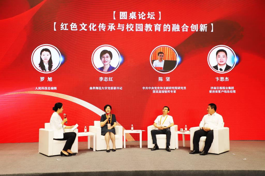 圆桌论坛环节,李志红与人民科技总编辑罗旭、中共中央党史和文献研究院研究员、国家高端智库专家陈坚等嘉宾围绕红色文化在高校的教育传播及红色文化在学校思政课教学中的应用展开了对话与交流。李志红着重介绍了学校丰富思政教育内容,拓宽红色文化传播渠道,创新思政教育载体形式,推动红色文化进课堂、进头脑方面的举措和经验。