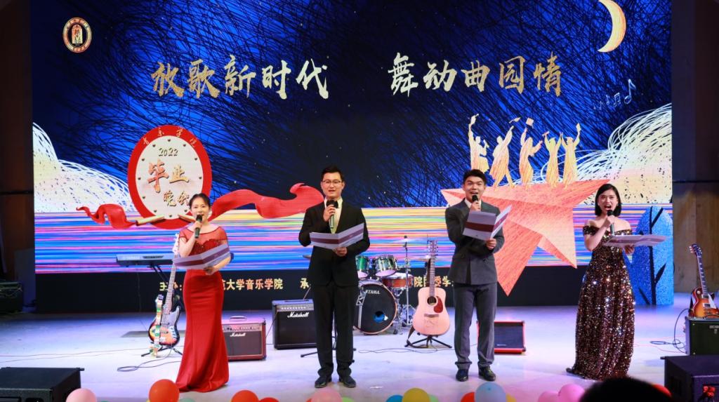 最后,音乐学院12位老师的《不说再见》MV为毕业生送上离别寄语,祝愿每一位毕业生和光同尘、与时舒卷,云程发轫、万里可期,愿此去繁花似锦、再相逢依旧如故。晚会在王捷、柏少荣、车霖、程西永四位老师的《祝你一路顺风》歌声中落下了帷幕。