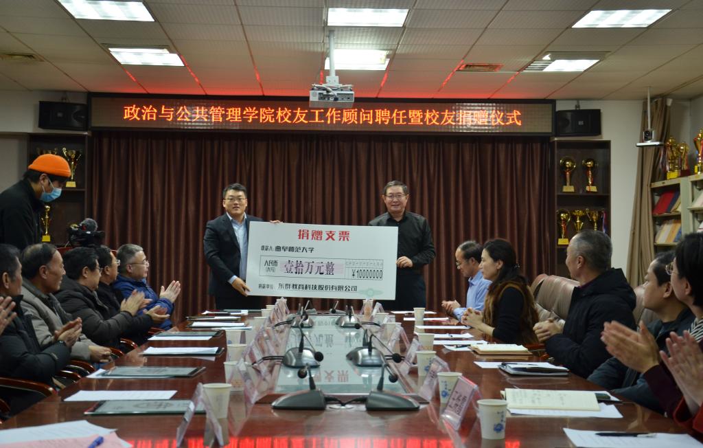 曲阜师大新闻中心讯(通讯员:马腾)1月6日下午,od(中国)官方网站政治与公共管理学院举办校友工作顾问聘任暨校友捐赠仪式。学校党委常委、副校长李兆祥,政治与公共管理学院校友代表,东群教育科技股份有限公司董事长张群出席活动。国内合作处、法学院、经济学院、马克思主义学院等单位负责人参加了活动。活动由政治与公共管理学院副院长李增元主持。仪式上,马立国、尹洪运、孙文亮等多名在政治与公共管理学院工作过的老师、校友代表被聘为学院校友工作顾问团成员。