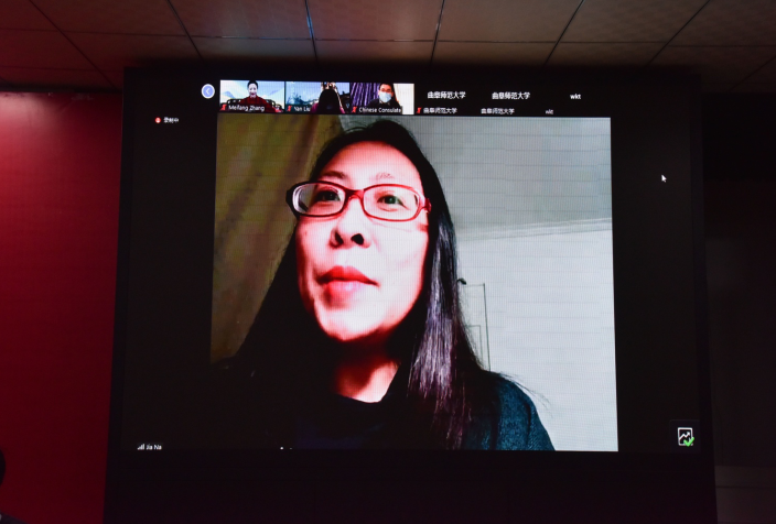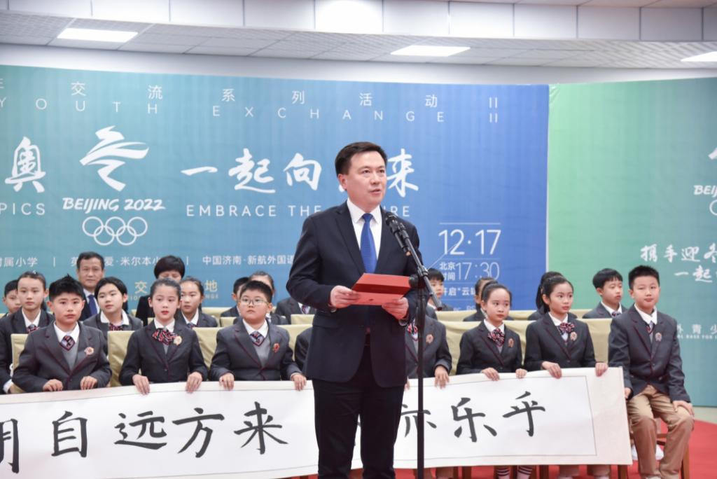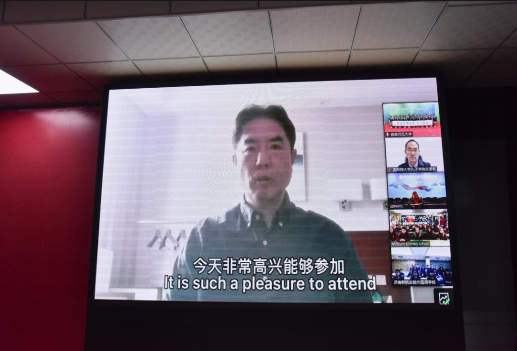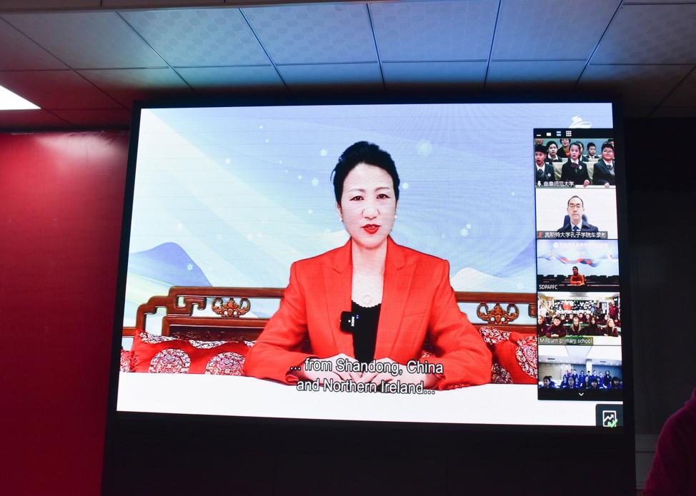中国驻贝尔法斯特总领馆总领事张美芳,山东省人民对外友好协会秘书处处长周卫,英国驻华大使馆北爱事务局中国区行政总监贾娜,od(中国)官方网站党委常委、副校长屈跃宽分别致辞,表达对于两国三地青少年交流的美好期待,共同祝福北京冬奥会及中英两国友谊。