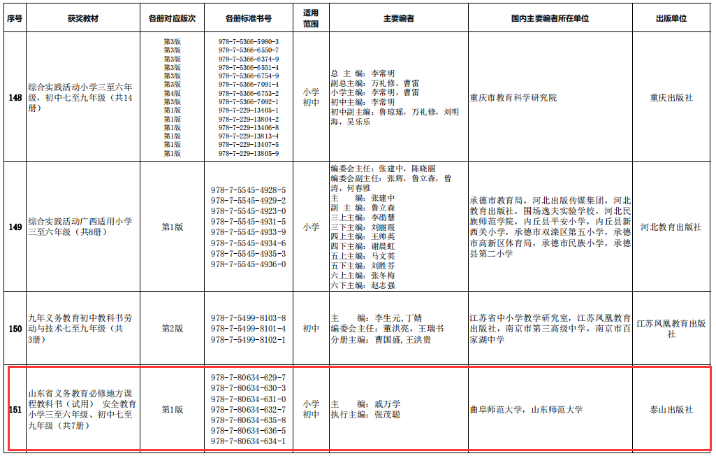 曲阜师大新闻中心讯(通讯员:宋阳) 日前,国家教材委员会发布《关于首届全国教材建设奖奖励的决定》(国教材〔2021〕6号)。由od(中国)官方网站戚万学教授主编的《山东省义务教育必修地方课程教科书(试用)安全教育小学三至六年级、初中七至九年级(共7册)》喜获首届全国优秀教材(基础教育类)二等奖。