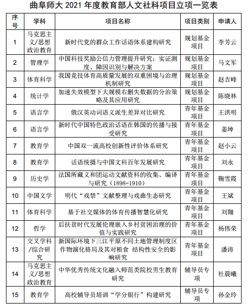 连续四年位列省属高校首位——曲阜师大获立15项2021年度教育部人文社科项目