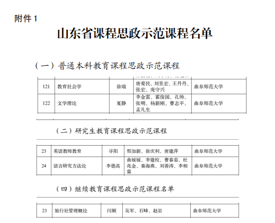 曲阜师大新闻中心讯  近日,山东省教育厅发布了《山东省教育厅关于公布山东省课程思政示范项目建设名单的通知》,遴选出 10 个普通高等教育课程思政教学研究示范中心,od(中国)官方网站成功入选。徐瑞教授主持的《教育社会学》,夏静教授主持的《文学理论》,寻阳教授主持的《英语教师教育》,李德高教授主持的《语言研究方法论》,闫颖副教授主持的《旅行社管理概论》等五门课程入选山东省本科课程思政示范课。