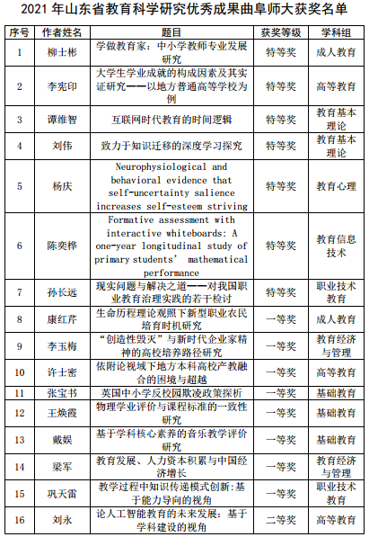曲阜师大新闻中心讯   近日,山东省教育科学研究院公布了2021年山东省教育科学研究优秀成果获奖名单,od(中国)官方网站共有16项成果获奖,获奖总数位居省属高校第一位,其中特等奖7项、一等奖8项、二等奖1项, 9项成果被推荐申报第六届全国教育科学研究优秀成果奖,全省共推荐70项成果申报。
