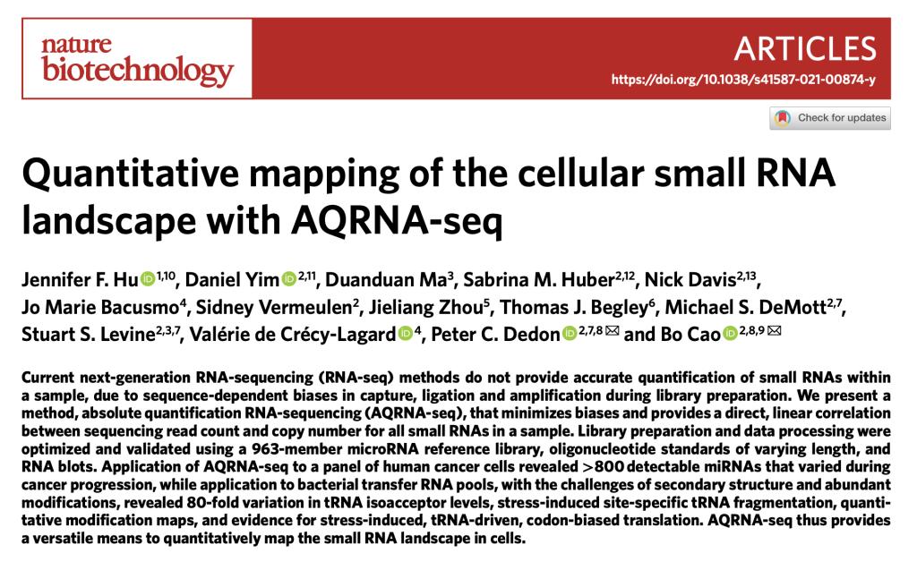 RNA组学研究,即通过对细胞中全部RNA分子进行系统研究,以从整体水平阐明RNA的生物学功能,是多年来后基因组时代生命医学领域的研究热点和重点。该项研究成果中,曹博教授历时4年开发了一种新型分子生物学技术AQRNA-seq,在国际上首次实现了对细胞内全局性RNA分子进行高通量测序、绝对定量分析、表观修饰定位、衍生片段代谢解析等全面组学分析,并通过国际合作利用该技术解析了结核杆菌在生长期-潜伏期转变过程中的tRNA及其衍生片段的表达和代谢图谱,以及人乳腺细胞癌变发生不同阶段中特征性miRNA图谱,为两种疾病的诊疗提供了新型RNA分子靶标。AQRNA-seq技术是RNA表观遗传调控研究的又一重要突破,将为RNA代谢和调控网络、癌症发生机理、分子诊断、人工干预等多方面的研究提供重要技术基础。