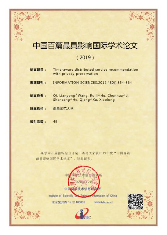 曲阜师大新闻中心讯 日前,2020年“中国科技论文统计结果发布会”在北京举行,会上发布了《中国卓越论文统计报告》,并评选出2019年中国百篇最具影响力国际学术论文。我校计算机学院齐连永教授团队在《Information Sciences》上发表的题为“Time-aware Distributed Service Recommendation with Privacy-preservation”的论文入选,山东省仅有5篇入选。