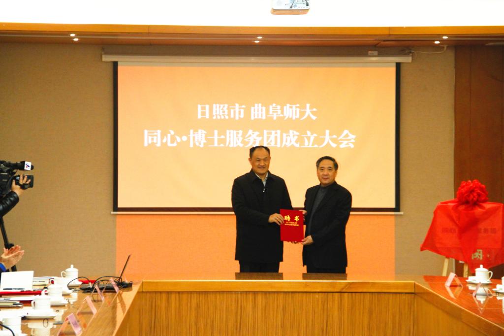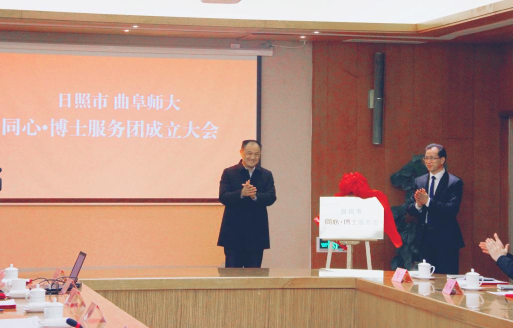 曲阜师大新闻中心讯(通讯员:王增圻  李毅   摄影:王增圻)  12月25日下午,曲阜师大与日照市共建的“同心·博士服务团”成立大会在日照宾馆举行。校党委常委、统战部部长乔正高,日照市委常委、统战部部长明铭,山东省政协委员、泰山学者特聘教授、工学院院长武玉强出席揭牌仪式。会议由日照校区党工委书记、校区办公室主任孔令军主持。