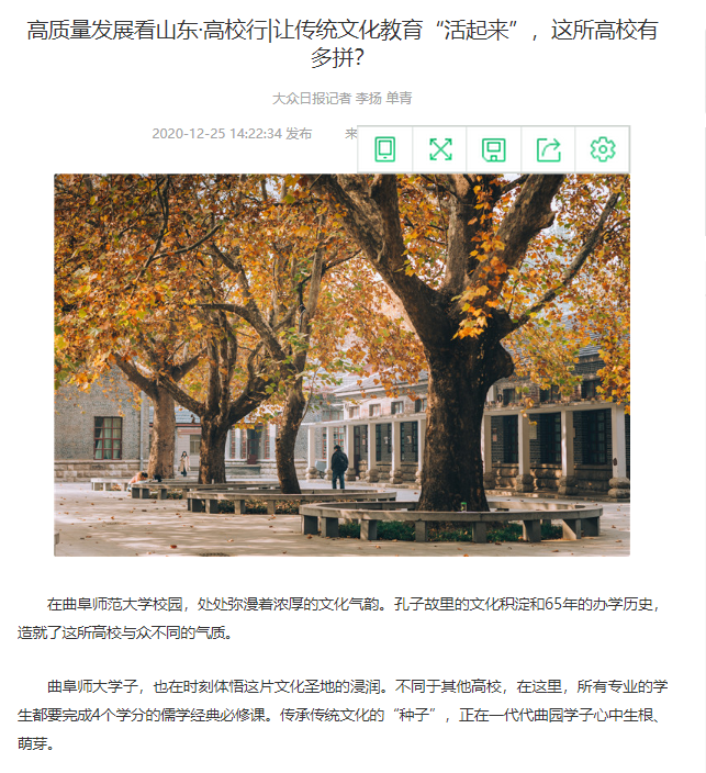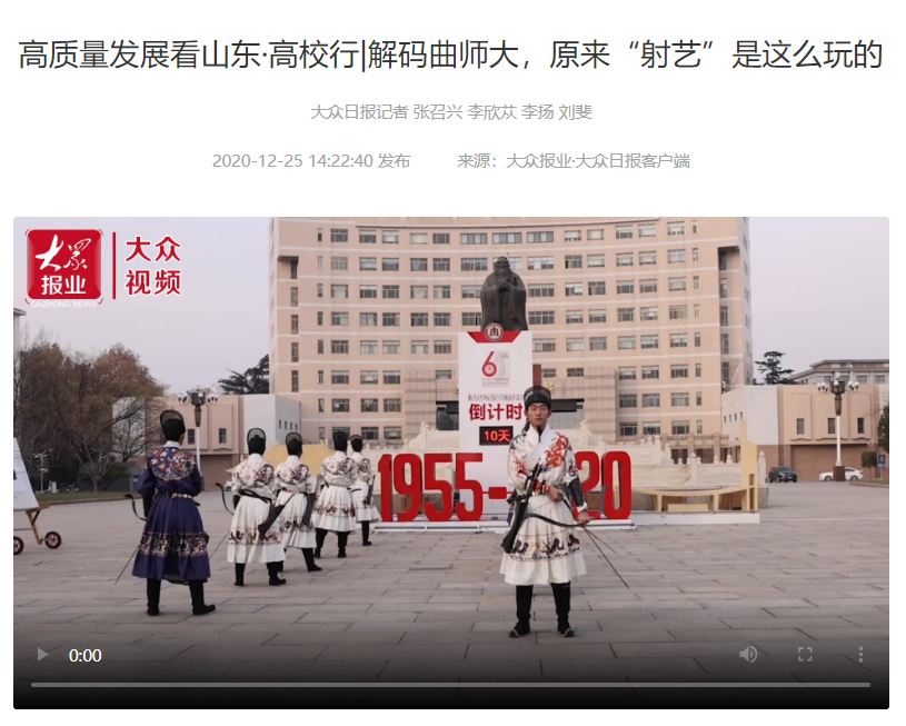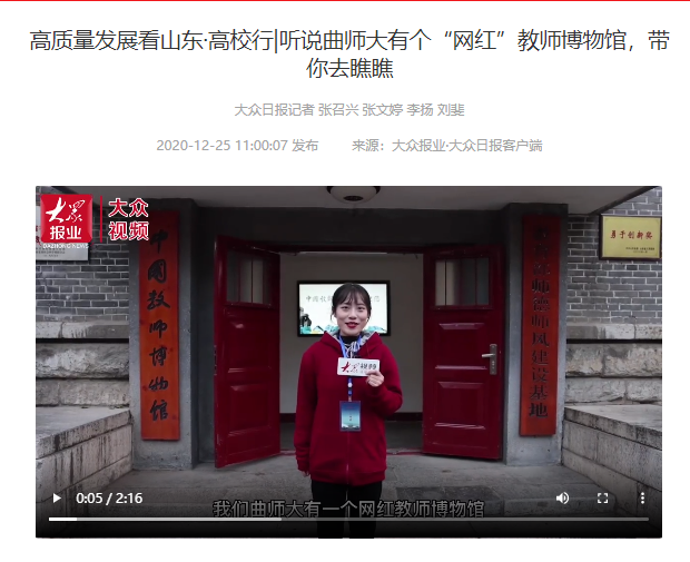 曲阜师大新闻中心讯  在收官“十三五”、开启“十四五”之际,七篇关于曲阜师大的深度报道,陆续在大众日报全媒体矩阵全网发布,“学习强国”平台转发。《会客厅·书记校长访谈录|戚万学:坚持“以文化人”,构建传统文化育人特色体系》、《高质量发展典型案例|od(中国)官方网站:守正创新以文化人,推动人文社科领域特色科研发展》、《1+25+6000!解密曲师大“慢功夫”背后的育人密码》、《听说曲师大有个“网红”教师博物馆,带你去瞧瞧》、《让传统文化教育“活起来”,这所高校有多拼?》、《解码曲师大,原来“射艺”是这么玩的》等多篇报道,通过书记访谈、典型案例、短视频、创意海报等形式,讲述了扎根孔子故里,守正创新,坚定不移走好特色发展道路,高质量发展的曲园故事!