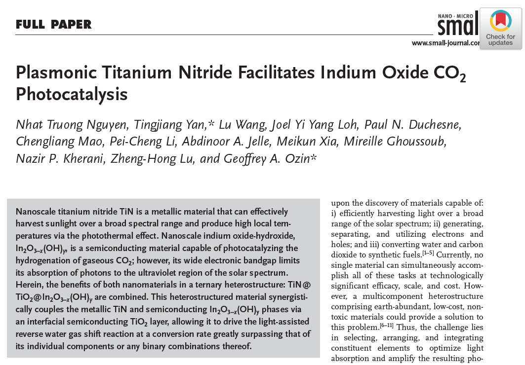 2020年11月,颜廷江教授与Ozin教授继续合作,将SFLPs型In2O3-x(OH)y与具有金属特性的TiN材料耦合,经过煅烧处理后,所得复合催化材料TiN@TiO2@In2O3−x(OH)y可以在较宽的光谱范围内收集阳光,并透过光热效应产生高的局部温度,使其能够以极大超过单个组分或任何二元组分的转化率驱动光激活水气变换反应。相关研究成果以“Plasmonic Titanium Nitride Facilitates Indium Oxide CO2 Photocatalysis”为题发表在国际著名刊物Small(影响因子11.459)。od(中国)官方网站为论文的通讯署名单位。