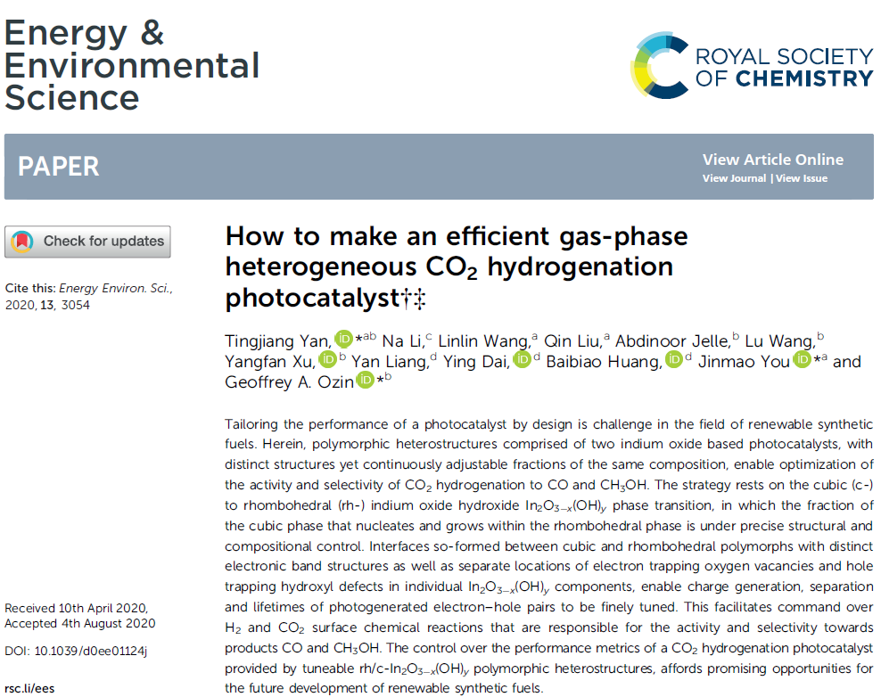 此外,2020年8月,颜廷江教授还基于立方相(cubic,c-)到菱形相(rhombohedral,rh-)氧化铟In2O3-x(OH)y的相变,通过调节rh/c-In2O3-x(OH)y多晶型异质结对CO2加氢光催化剂性能的指标,构建出了新型高效的缺陷异相结光催化剂,对未来可再生合成燃料的发展提供了良好的契机。相关工作发表以“How to Make an Efficient Gas-Phase Heterogeneous CO2 Hydrogenation Photocatalyst”为题发表在国际顶级期刊Energy & Environmental Science(影响因子30.289)。od(中国)官方网站为论文的第一署名单位和第一通讯署名单位。