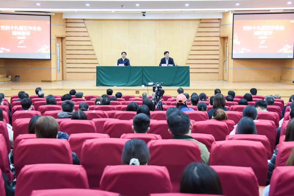 邓云锋指出,学习宣传贯彻好党的十九届五中全会精神是当前及今后一个时期的重要政治任务,学懂弄通做实全会精神必须把握好“五个坚持”,即坚持党的全面领导、坚持以人民为中心、坚持新发展理念、坚持深化改革开放、坚持系统观念;科学制定学校“十四五”发展规划,全面落实立德树人根本任务,深化教育评价改革,推动高校高质量特色发展,提升高等教育人才培养水平;集中抓好学习宣传贯彻,要真学真懂、切实在领会精神实质上狠下功夫,要深学深问、切实在明确努力方向上狠下功夫,要笃学笃行、切实在贯彻全会精神上狠下功夫。