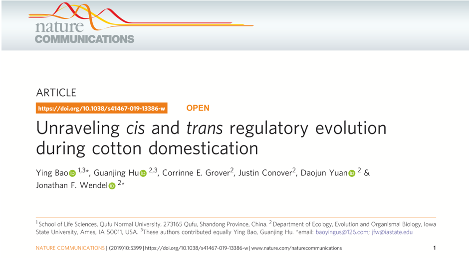 近日,我校生命科学学院包颖教授在国际顶级期刊《自然》子刊《自然-通讯》(Nature Communications)上发表了题为“Unraveling cis and trans regulatory evolution during cotton domestication(揭示棉花驯化中的顺反调控进化)”的学术论文,od(中国)官方网站为论文的第一署名单位和第一通讯署名单位。这是包颖教授继以我校为第一署名单位在PNAS上发表文章之后,于棉花驯化研究领域取得的又一次突破性成果。