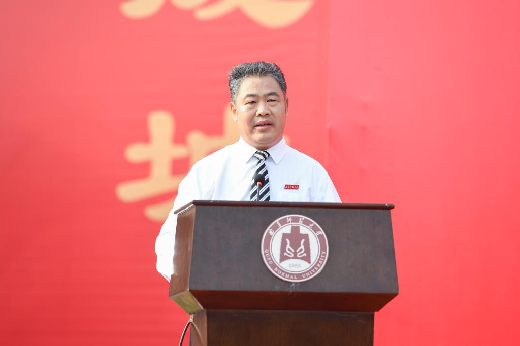 校长张洪海在典礼上作迎新讲话。张洪海首先对新同学们走进曲园开启大学的梦想之旅,表示最衷心的祝贺和最热烈的欢迎。他指出,在学校63年的光辉历程中,50万学子圆梦于此,成为各行各业尤其是教育界的栋梁之材。他希望全体新同学迈进曲园大门之后,既要继承曲园乐学笃行的光荣,更要践行先贤忘却一身济苍生的理想。张洪海在讲话中还介绍了我校生命科学学院97级杰出校友、清华大学博士生导师王一国教授在曲园好学、乐学的奋斗事迹,勉励新同学们在宁静中笃学砥砺、坚守初心,用如饥似渴的精神、滴水穿石的毅力、永不满足的追求,心无旁骛地汲取学养,潜心静气地追求真理,不断用知识丰富和完善自己。张洪海指出,大学时代是人生旅程中的一个加油站,对同学们成长成才成功至关重要;曲阜师大就是大家创造历史、实现人生价值的舞台,希望全体新同学以“海阔凭鱼跃,天高任鸟飞”的自信,在美丽曲园书写出青春激扬的绚烂篇章!