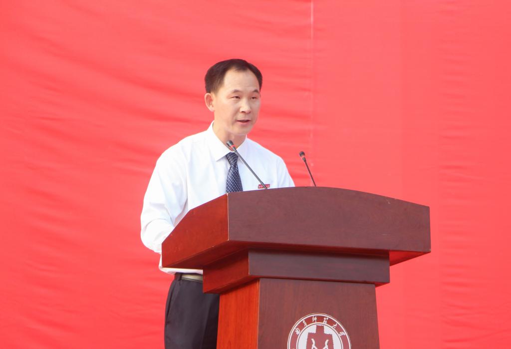 杰出校友代表、清华大学王一国教授在典礼上致辞。他首先祝贺各位新同学迈入曲阜师大这所出色的高等学府,同时祝贺各位老师在园丁的道路上又收获了新的动力。王一国与新同学们分享了自己求学奋斗的心得,希望大家以自信、自知、自强的姿态,在曲园这种少了浮躁、多了朴实的环境里,以“学而不厌”的精神去施展抱负、实现理想。他建议大家在大学期间要选择一个用力跳够得着的目标,作为自己的起点和动力,为之不懈努力。王一国在致辞中希望全体曲园人共同努力把曲阜师大这个大家庭建设更加美丽、更加温馨、更加出彩!