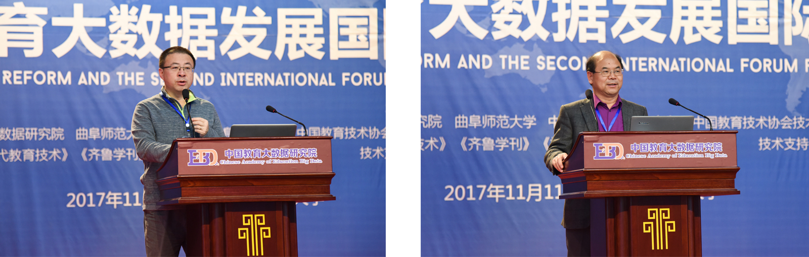 中国教育技术协会副会长、清华大学《现代教育技术》主编钟晓流作报告(左)