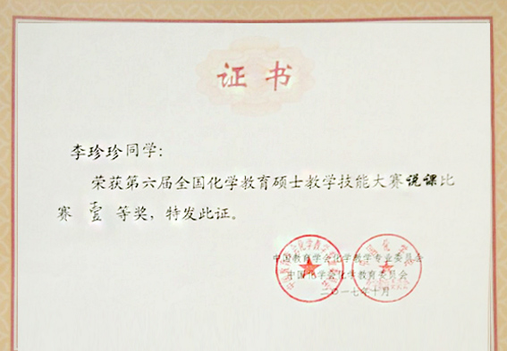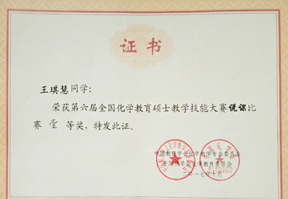 10月16日,由中国教育学会化学教学专业委员会、中国化学会化学教育委员会主办,辽宁师范大学承办的第六届全国化学教育硕士教学技能大赛决赛在大连举行。我校化学与化工学院姬广敏老师指导的2016级研究生王文秀凭借优秀的教学素质脱颖而出,获得决赛特等奖,苗深花老师指导的研究生李珍珍和王琪惠同样表现出色,获得决赛一等奖。苗深花和姬广敏老师被评为“优秀指导教师”。