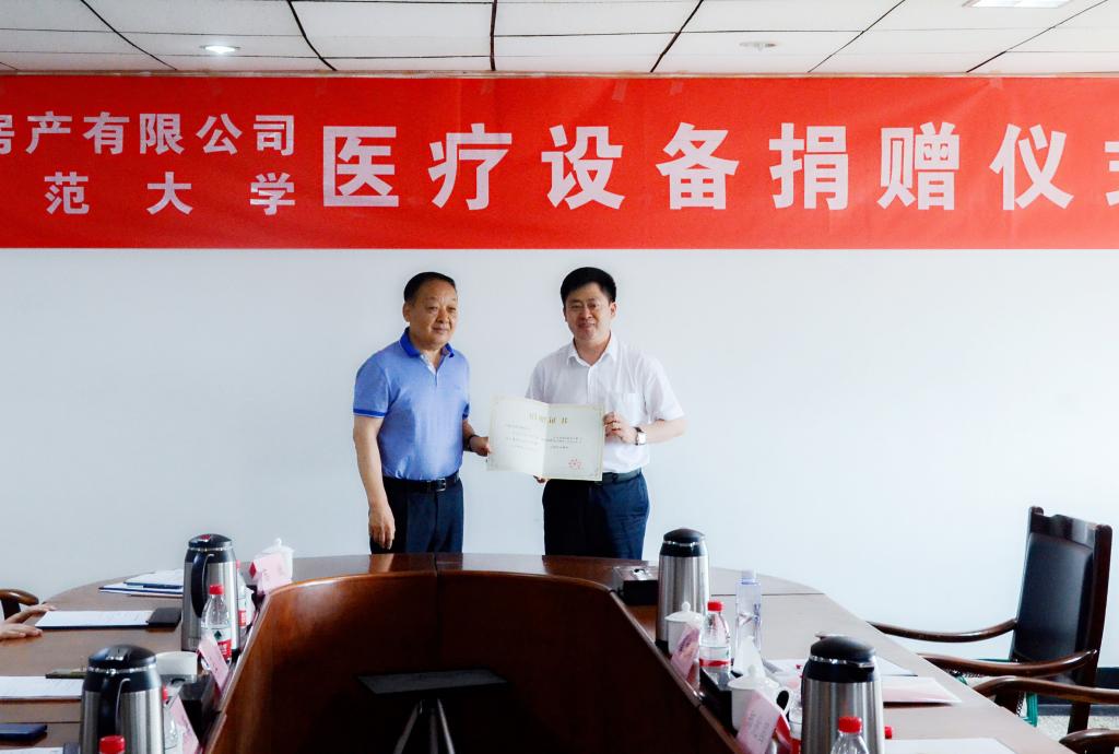 王成玉对我校取得的办学成就表示祝贺,对学校为济宁经济社会发展做出的重要贡献表示感谢,并表示将充分发挥工商联桥梁和平台作用,为曲师大加快开放办学和深化校企合作提供帮助。郑兆国简要介绍了济宁大地房产开发有限公司的情况,希望通过此次捐赠活动,让学校师生接受更好的医疗服务,为学校事业发展贡献一份力量。