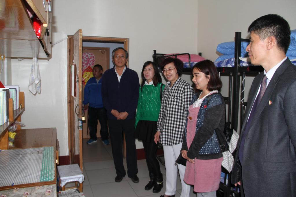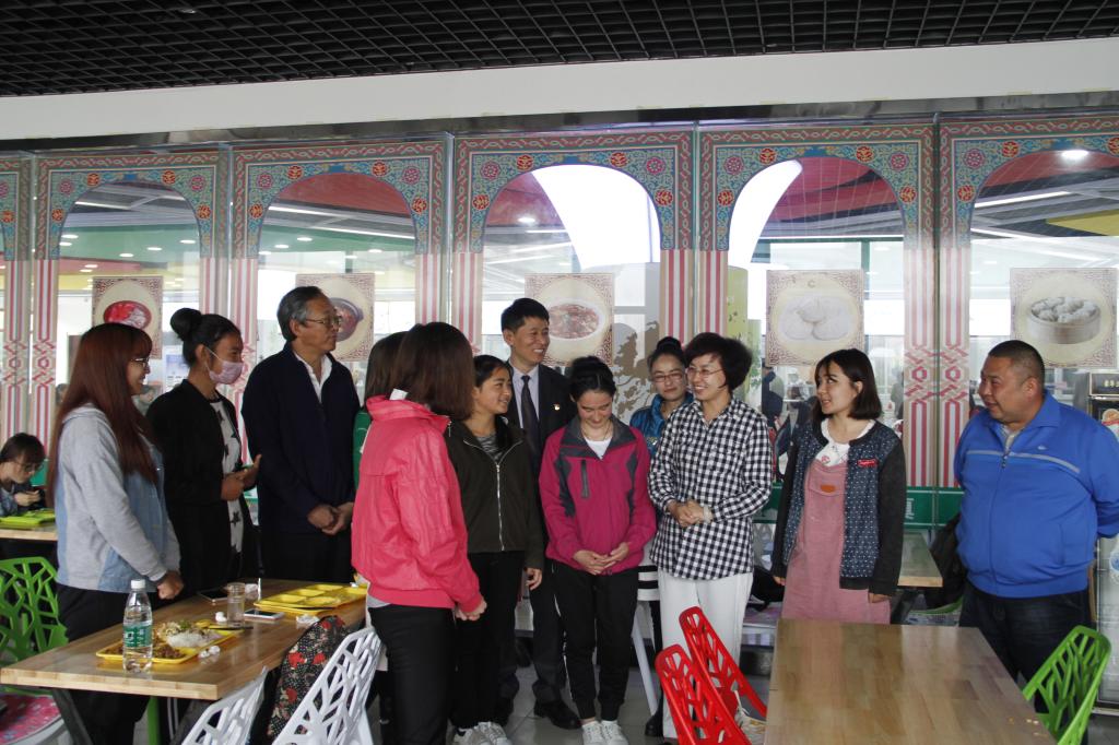 座谈后,高培香一行来到学生生活园区的清真食堂、学生寝室等实地调研,看望新疆籍少数民族学生并与他们亲切交谈,详细询问了大家的生活、学习和思想状况,勉励大家珍惜学习机会,全面提升素质,做好民族文化交流的使者、民族团结进步的栋梁。