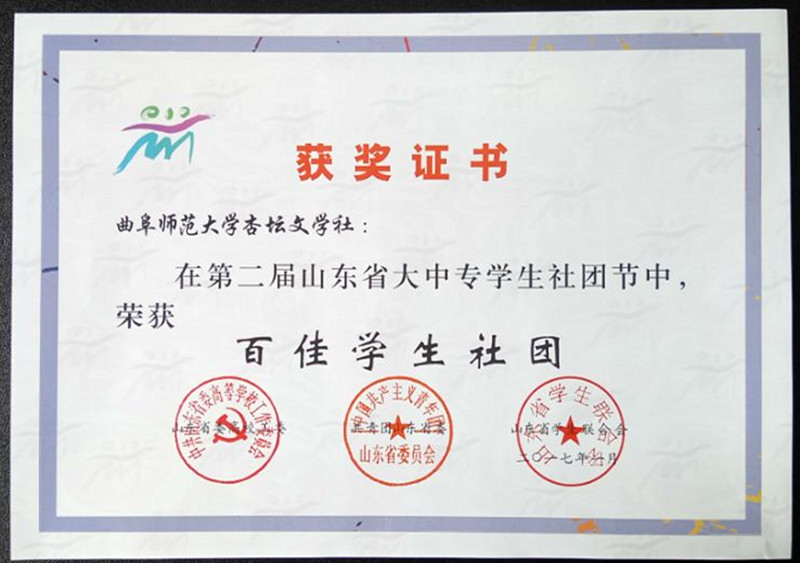 近日,省高校工委、团省委、省学联对第二届山东省大中专学生社团节中表现突出的单位和社团进行了表彰,我校获优秀组织奖,学生社团杏坛文学社、大学生习近平治国理政思想研究会获百佳学生社团荣誉称号。