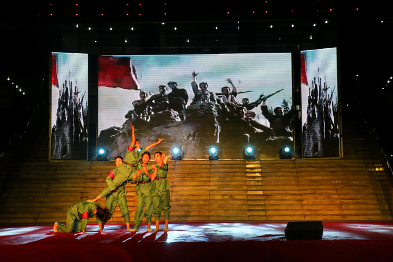 “红星闪闪放光彩,红星灿灿暖胸怀,跟着毛主席跟着党,闪闪的红星传万代……”随着脍炙人口的歌声响起,整场晚会在《闪闪的红星》合唱声中拉开帷幕。