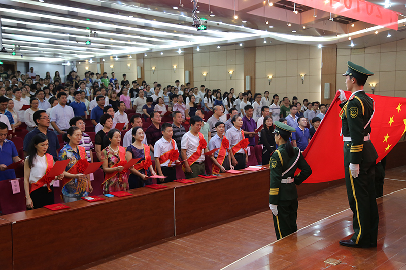 为进一步加强教师师德建设,切实增强教师教书育人的责任感、使命感和荣誉感,今年教师节大会专门设置教师集体宣誓环节。在国学院院长傅永聚教授的带领下,我校教师代表面对国旗,右手举拳,字句铿锵,庄严宣誓:“忠诚教育事业,履行教师职责。修身立德,行为世范;追求真理,学而不厌;传道授业,诲人不倦;杏坛伟业,吾辈勇担。山高水长,永志承诺,尼山黄海,鉴我志节。”一句句肺腑誓言昭示着老师们争做“四有”老师的热忱之心。