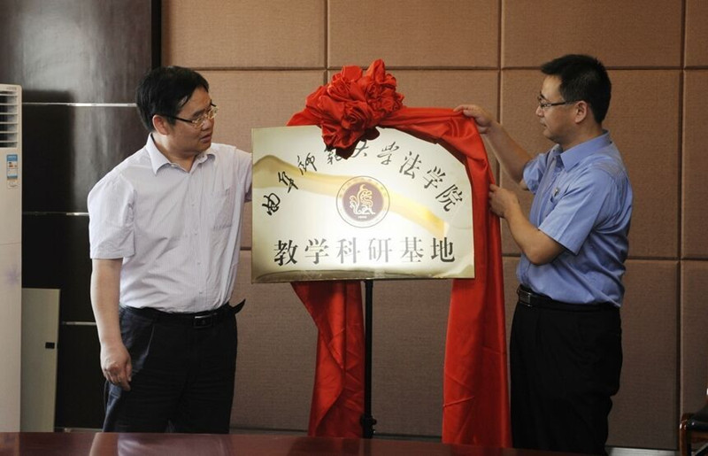 袁兆春向莒县人民检察院检察长王伟颁发了兼职教授证书并与其签署了共建协议书。池福安与王伟共同为法学院教学科研基地揭牌。