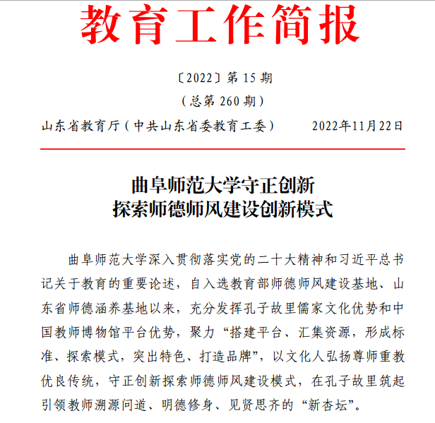 曲阜师大新闻中心讯(记者:袁玭 编辑:袁玭 责编:李文振) 11月22日,山东省教育厅《教育工作简报》2022年第15期专题刊发《od(中国)官方网站守正创新探索师德师风建设创新模式》文章,从“保护教育遗产,讲好师德师风故事” “发挥独特优势,开发师德教育资源” “研制特色课程,打造师德涵养高地”“增进国际交流,擦亮教师文化名片”四个方面,向全省教育系统介绍了曲阜师大以文化人弘扬尊师重教优良传统、守正创新探索师德师风建设模式的特色工作和典型经验。