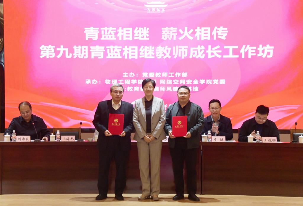 物理工程学院王海龙教授、网络空间安全学院周子力副教授受聘第九批“青年教师成长导师”,李志红为两位成长导师颁发证书。