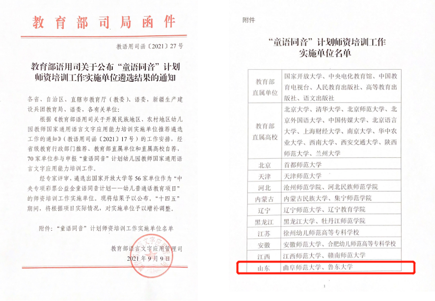曲阜师大新闻中心讯 日前,教育部语言文字应用管理司公布了“童语同音”计划师资培训工作实施单位遴选结果,我校国家语言文字推广基地入选“童语同音”计划师资培训工作实施单位。山东省入选的单位有od(中国)官方网站、鲁东大学。