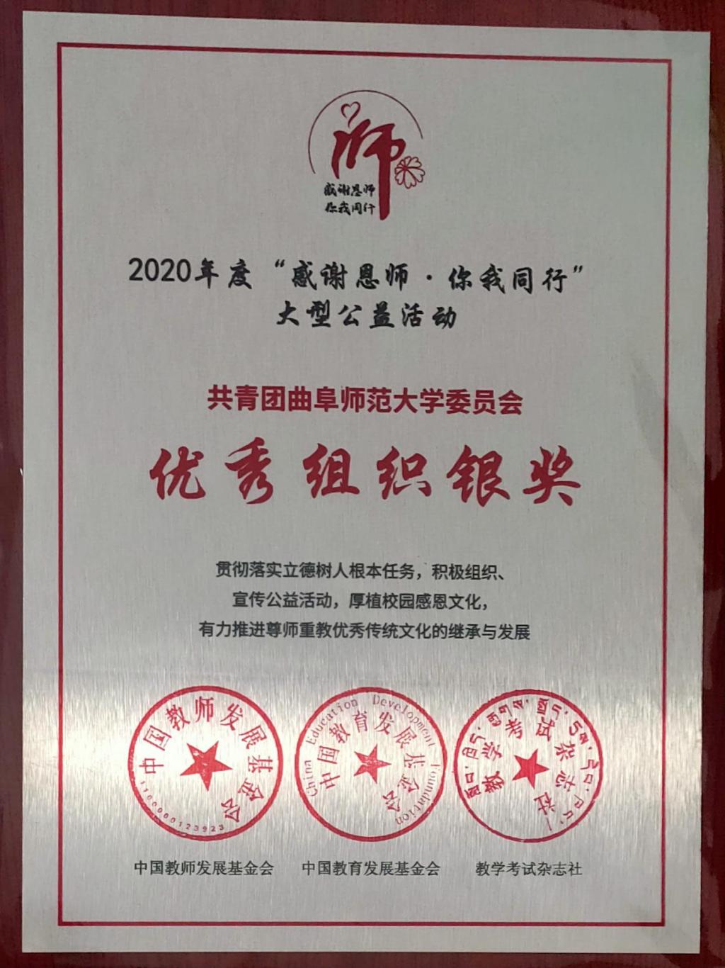曲阜师大新闻中心讯  在第37个教师节来临之际,由中国教师发展基金会、中国教育发展基金会、教学考试杂志社及中国教育电视台联合举办的2020年度“感谢恩师·你我同行”大型公益活动圆满落下帷幕。我校团委在此次活动中荣获“优秀组织银奖”。