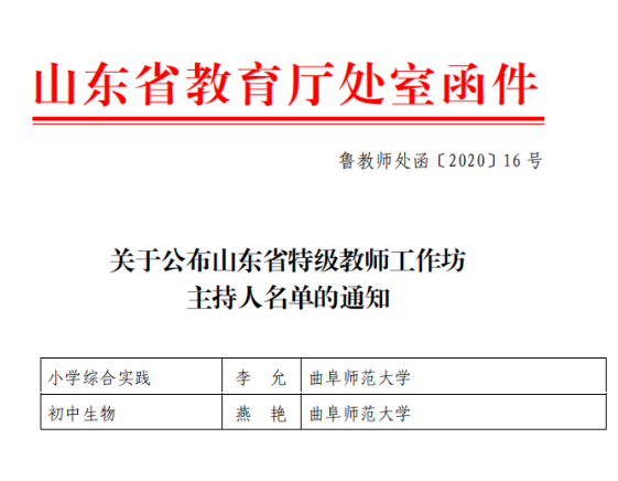 曲阜师大两名教师入选山东省特级教师工作坊主持人